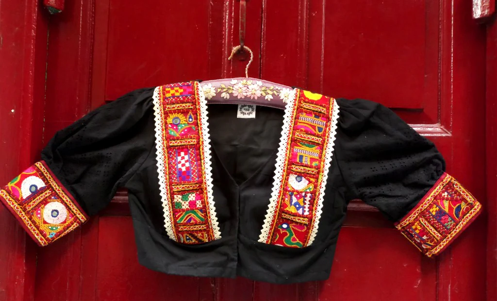 On black Hakoba version of our quintessential Vintage Blouse we have used vintage hand embroidered Kutch Patches as front flaps and on the sleeves. A blouse that can be paired with all colours of the rainbow and some more.