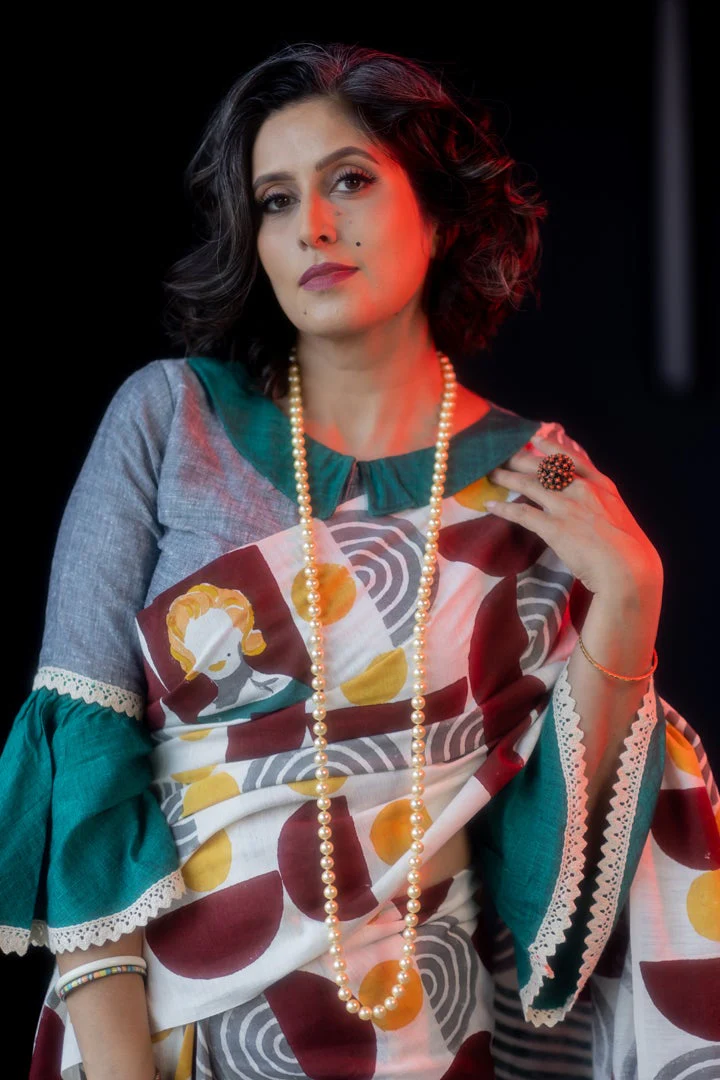 The blouse shows the Marilyn all decked up and her iconic pink lipstick. We have reimagined her flowy skirt on the sleeves of the blouse. Chic-retro yet timeless - Just like her!