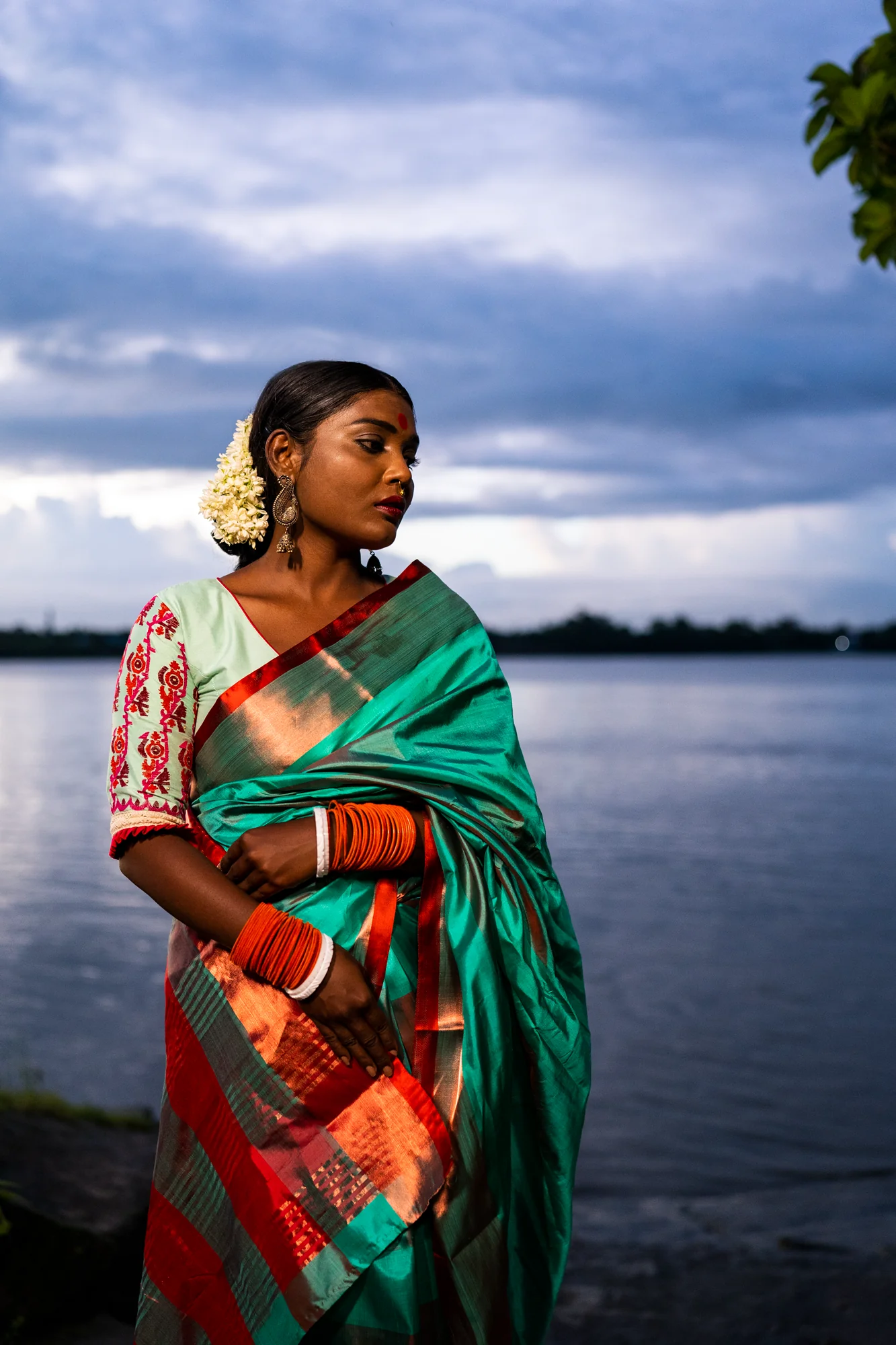 Saree: The model is wearing MINT ORANGE SAREE - https://paramacalcutta.com/collections/chhuti/products/mint-orange-saree