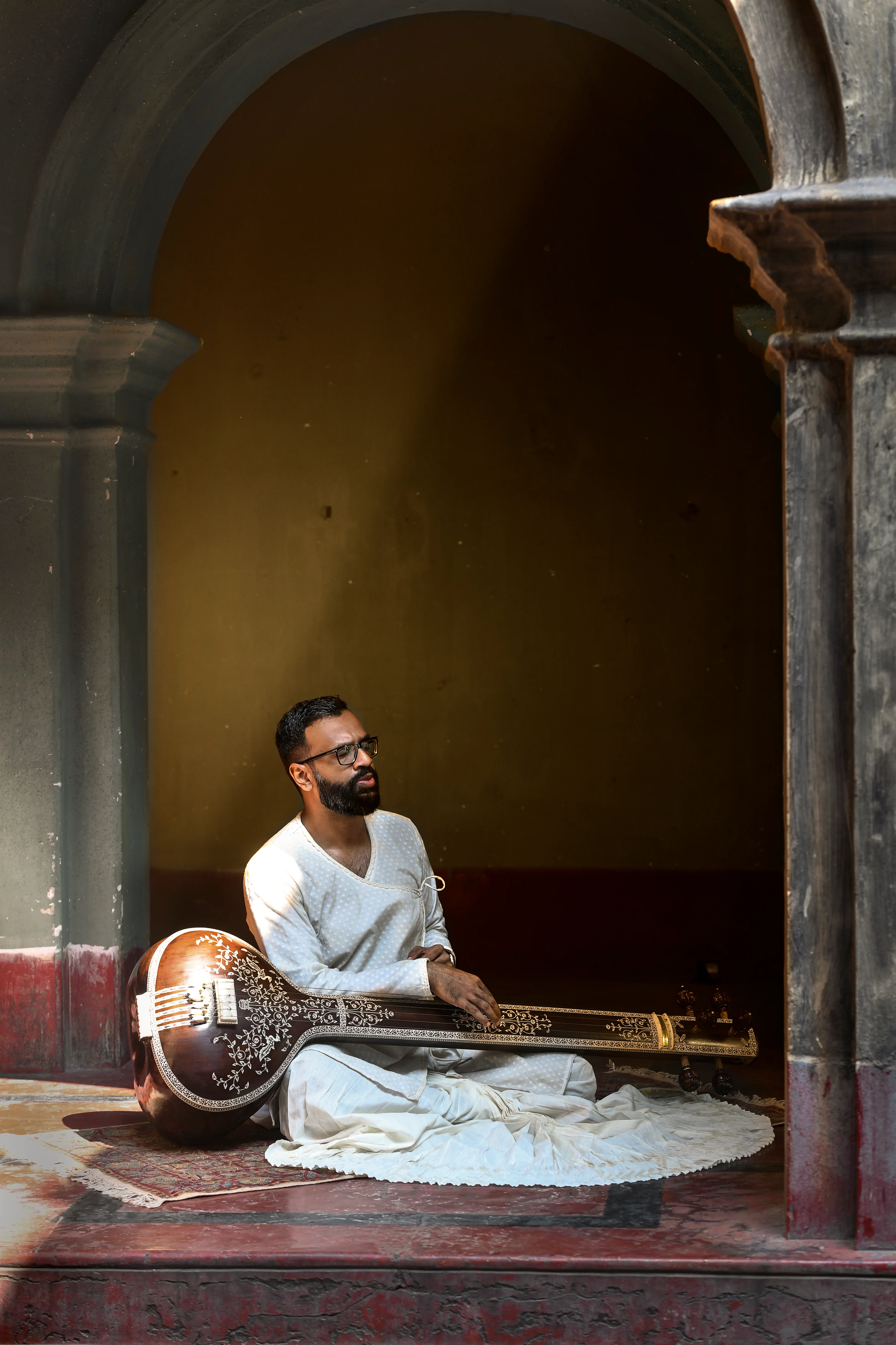 On handwoven khaki we have done traditional needle jamdani work with silver and gold threads. Entirely handwoven in Katwa, West Bengal using age old jamdani technique. Takes more than 15 days to complete one dhuti.