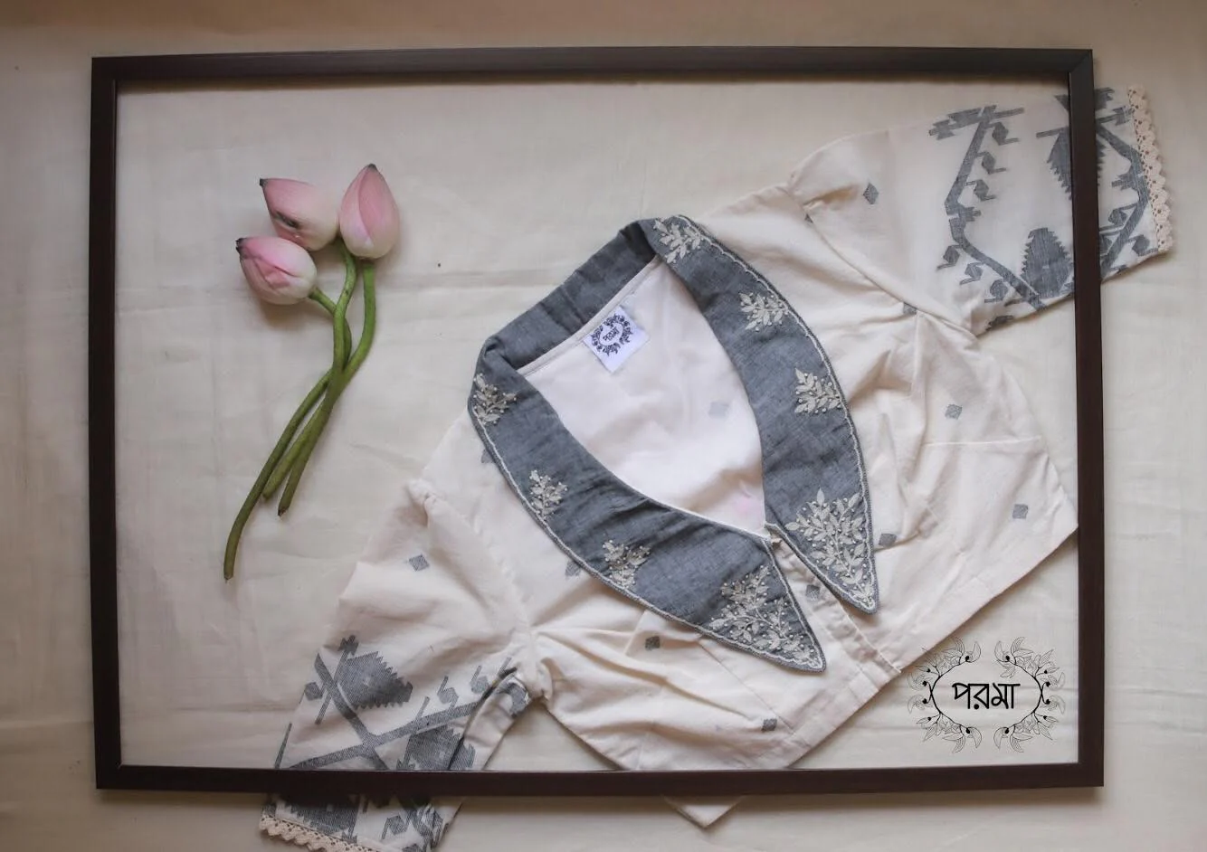 On white dove soft Jamdani woven fabric, a tiny patch of happy flowers are hand embroidered and fenced with lace. The grey collars on the front also have cute little bunch of flowers. Of all the blouses we have made till date, this is the only one I can call Victoriar Pori. For me it is the epitome of all things delicate and beautiful.